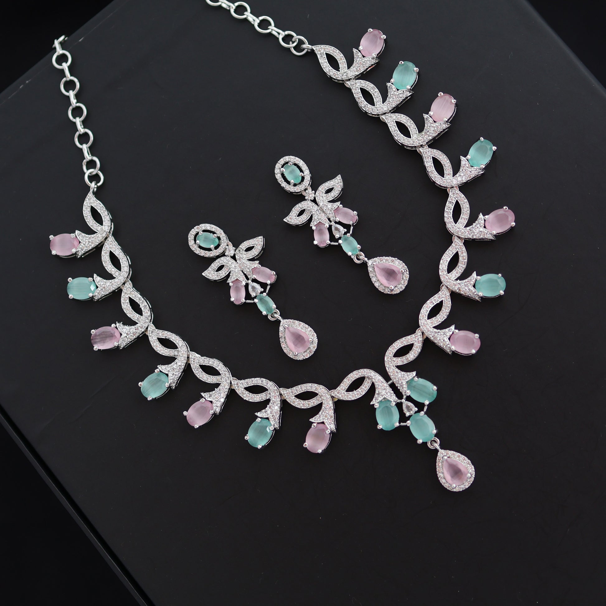 WhatsApp For CODBlush Mint Petals Designer AD Necklace Set. Featuring rose-pink and mint-green stones paired with shimmering AAA American Diamonds, this pastel vine-design set brings a soft, luxurious glow to any outfit.