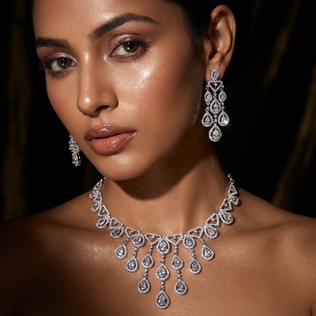 The Diamond Cascade Chandelier Necklace Set, a mesmerizing creation from Manvi Fashion Jewellery by Radius. This necklace is a true statement piece, designed to capture the light and create a fluid, shimmering effect with every movement.