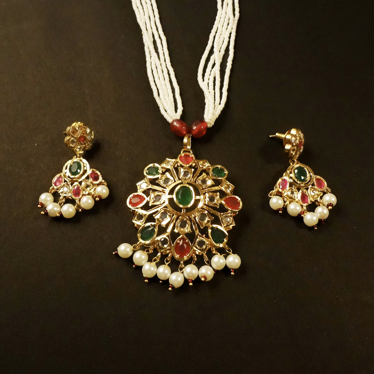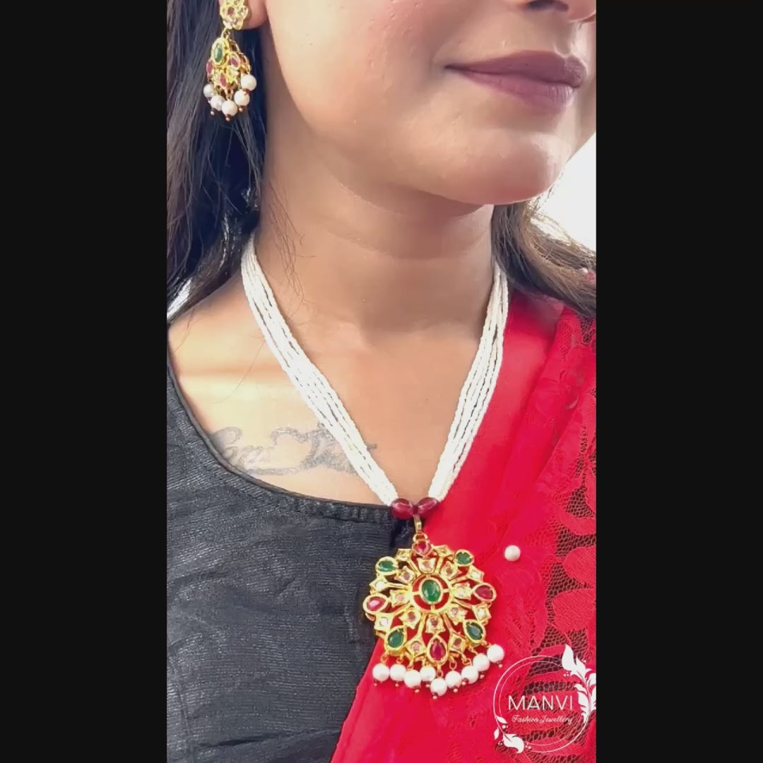 Shop Multi-Color Floral Kundan Long Necklace Set, featuring vibrant Kundan stones, pearls and white beads. Intricate floral designs for a regal and eye-catching look.