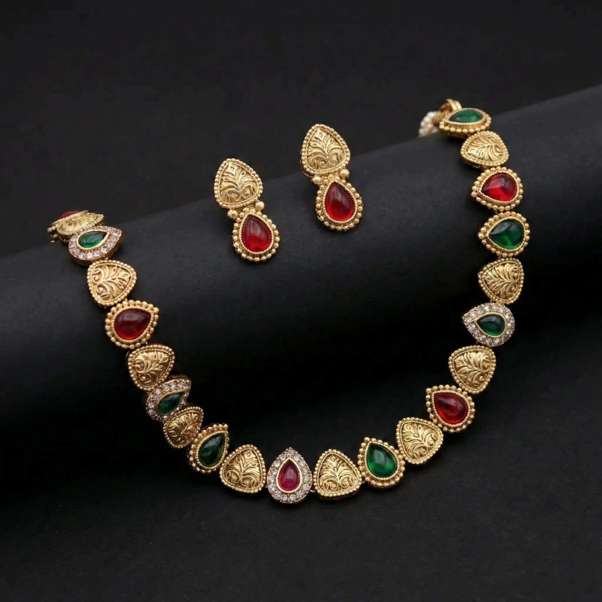 - Earring Style: Matching drop earrings featuring the same radiant red and green stones.