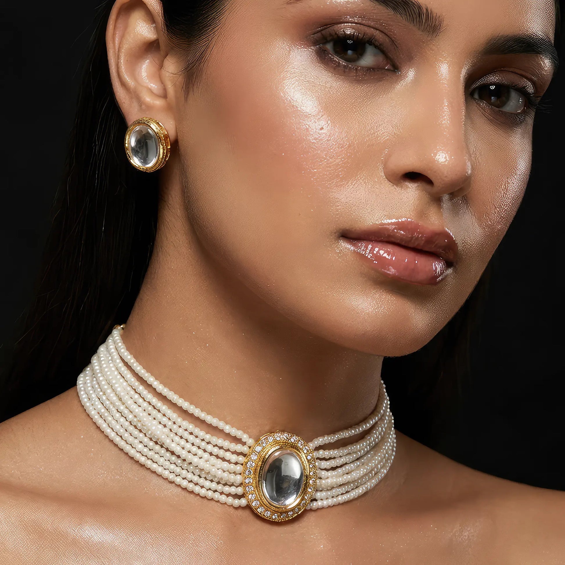 The Muktanjali Set by Manvi Fashion Jewellery by Radius is a soulful tribute to the grace of Indian craftsmanship. It features a rhythmic, flowing design of multiple strands of lustrous white beads, designed to rest gently against your neckline with a fit that feels light and regal. Every detail is finished in a warm, inviting gold tone that radiates an enduring, heritage-inspired glow.